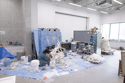 さまざまな素材、表現技法を学び、各自が制作を行える広々とした実習室です。美術1~3室では主に彫刻の制作を行っています。
