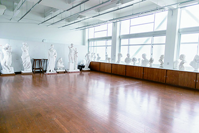 学生が自由に全身像の石膏像をデッサンできる施設です。移動式の台に置かれた像もあり、学生が描きたい場所でデッサンできるよう配慮されています。