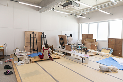 さまざまな素材、表現技法を学び、各自が制作を行える広々とした実習室です。主に専攻科生が日本画の制作を行っています。