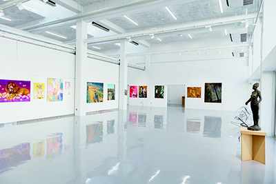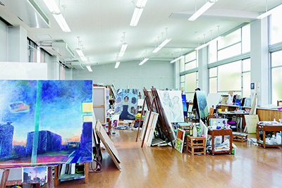 さまざまな素材、表現技法を学び、各自が制作を行える広々とした実習室です。油彩画・日本画・ミクストメディアなどの制作を行っています。