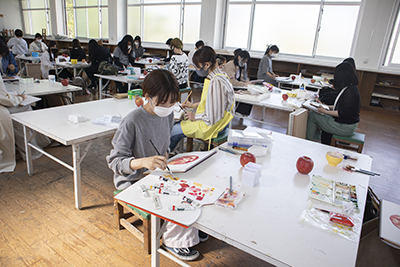 子どもたちの造形美術に対する興味や感性を引き出し、創作の喜びや楽しさを味わってもらうことを目的とした地域貢献活動(2005年より毎年実施)。県内各地の小学校を訪れて、学生と子ども達が一緒になって作品づくりを体験します。