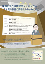 12月14日(土)13時30分から本学人文棟 大講義室にて、大分県内の教育の情報化及び本学の情報教育に長年にわたり尽力された凍田和美教授の退職を記念し、シンポジウム「大分県の教育の情報化のあゆみとゆくえ」を開催します。