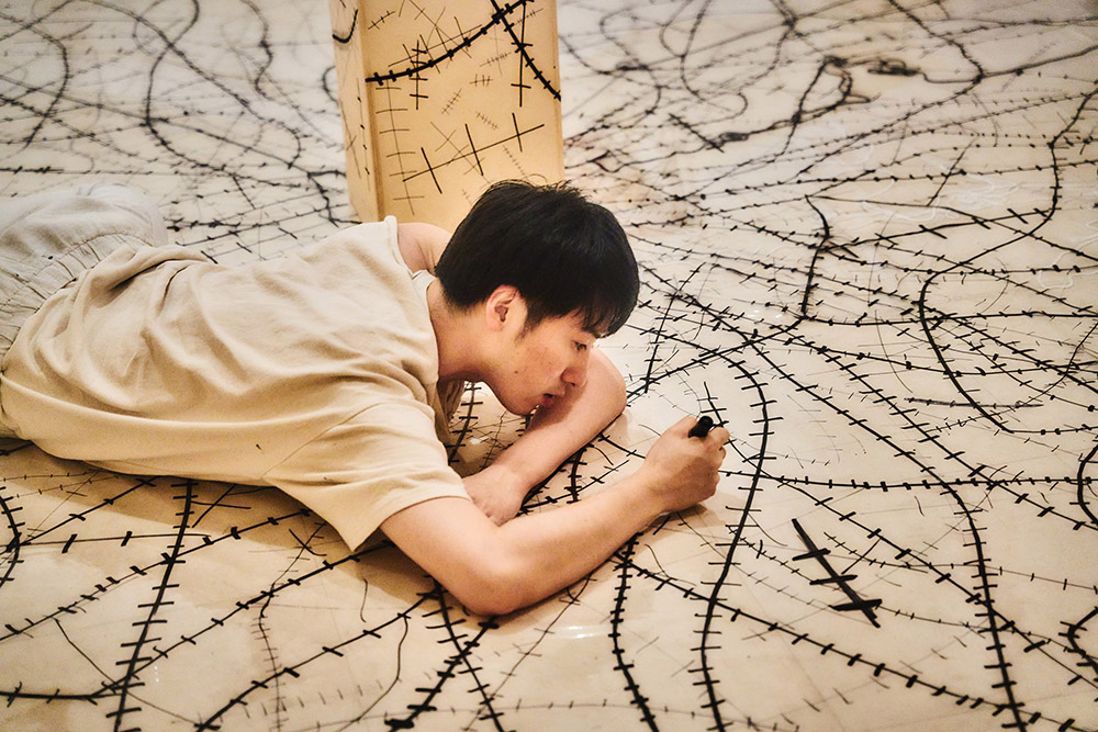 そして今回の個展では沢山の傷が集い、傷がより強力な網へと変化し、僕が幼少期から大好きだった果実〝メロン〟というモチーフが登場する所がみどころとなっております。