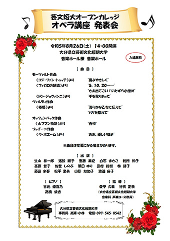 芸短オープンカレッジ「オペラ講座発表会」を、8月26日(土)14:00より、本学音楽ホール棟 音楽ホールで開催します。