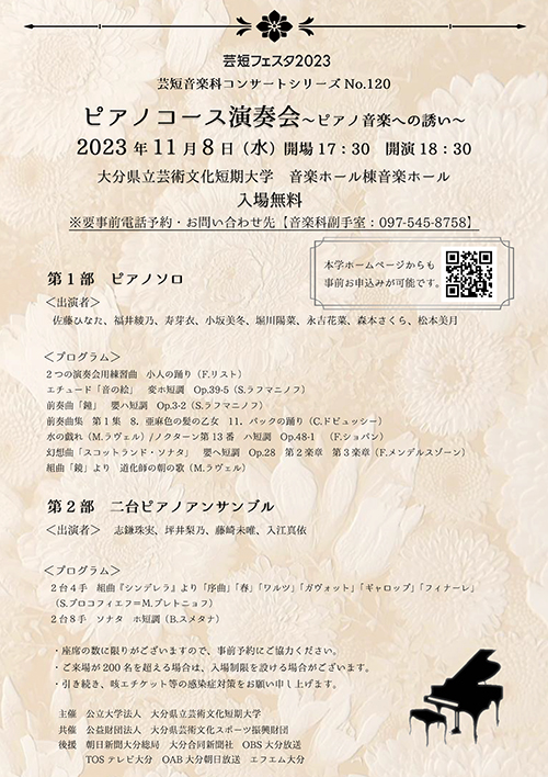 芸短音楽科コンサートシリーズNo.120「ピアノコース演奏会~ピアノ音楽への誘い~」を開催します