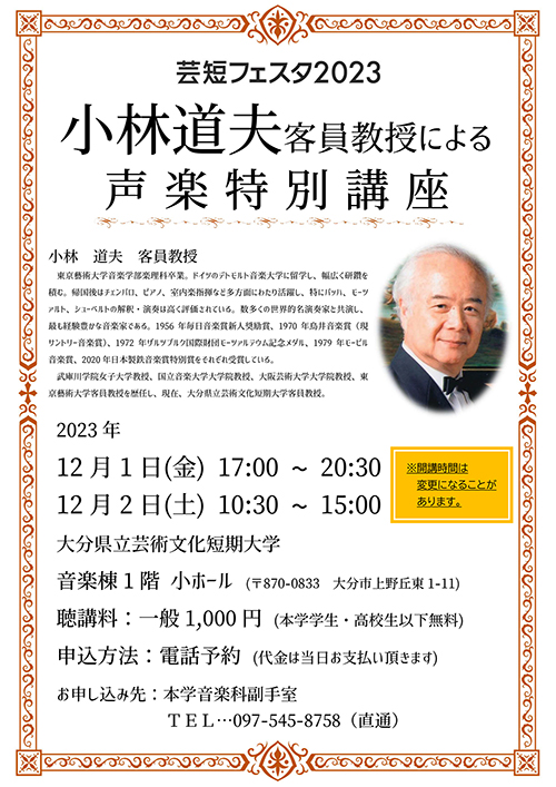 本学音楽科・小林道夫客員教授による声楽公開講座を12月1日(金)、2日(土)に開催します。