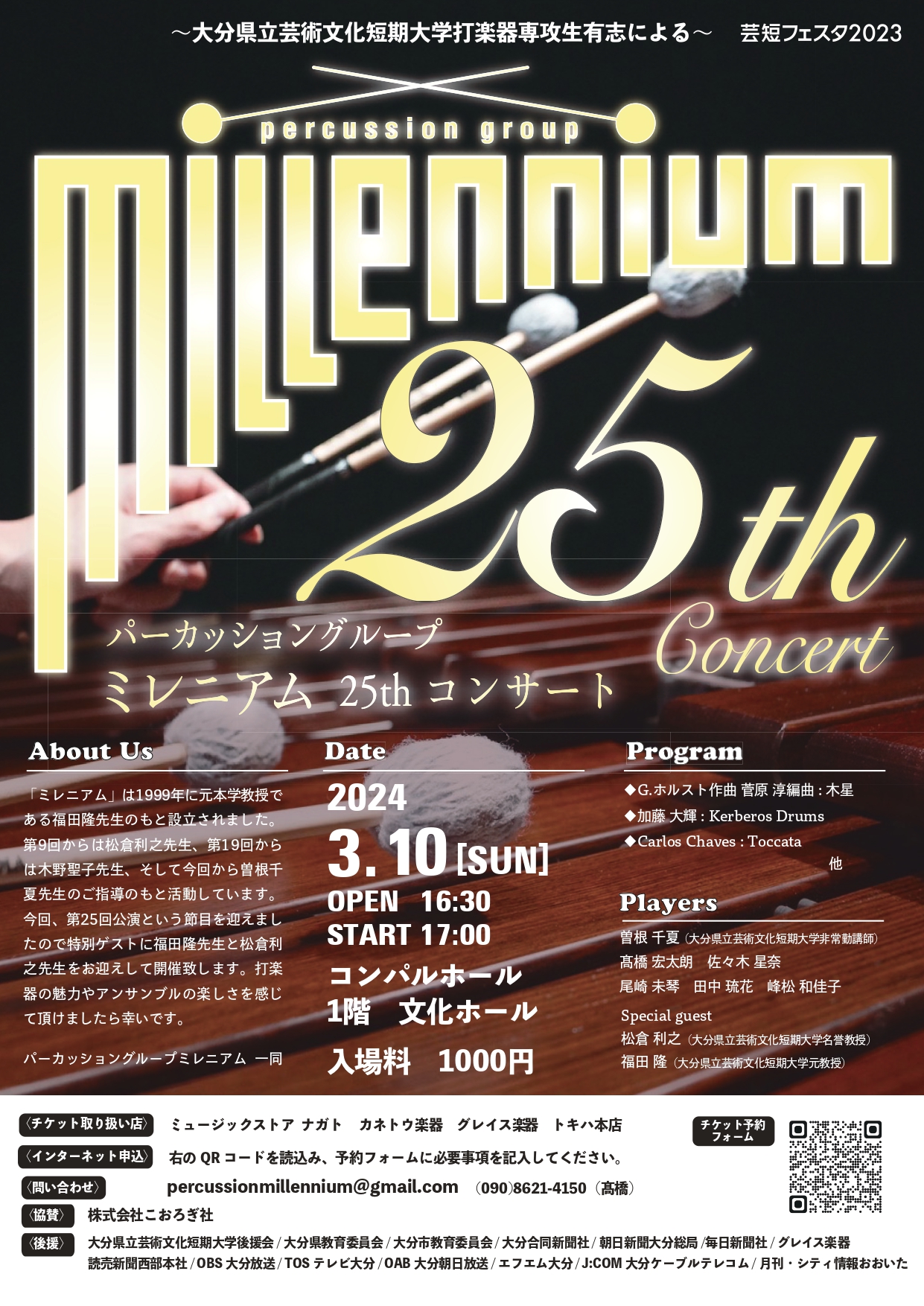 2024年3月10日(日)、コンパルホールにて、本学音楽科打楽器専攻生による打楽器アンサンブルの演奏会「パーカッショングループミレニアム25thコンサート」を開催します!