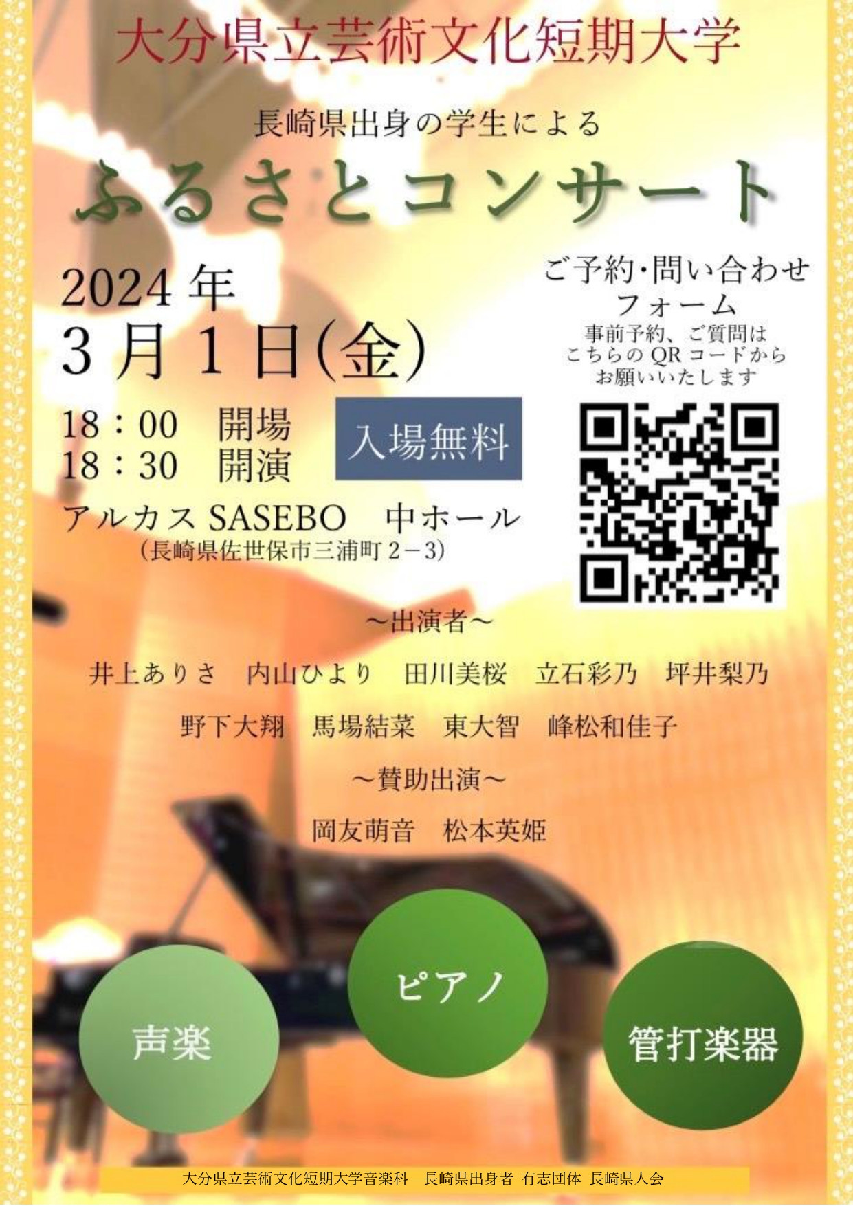 大分県立芸術文化短期大学長崎県出身学生による「ふるさとコンサート」を開催します