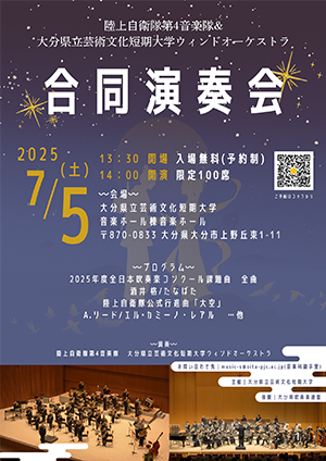7月5日(土)、本学音楽ホール棟音楽ホールにて、陸上自衛隊第4音楽隊と本学ウィンドオーケストラの合同演奏会を開催いたします。