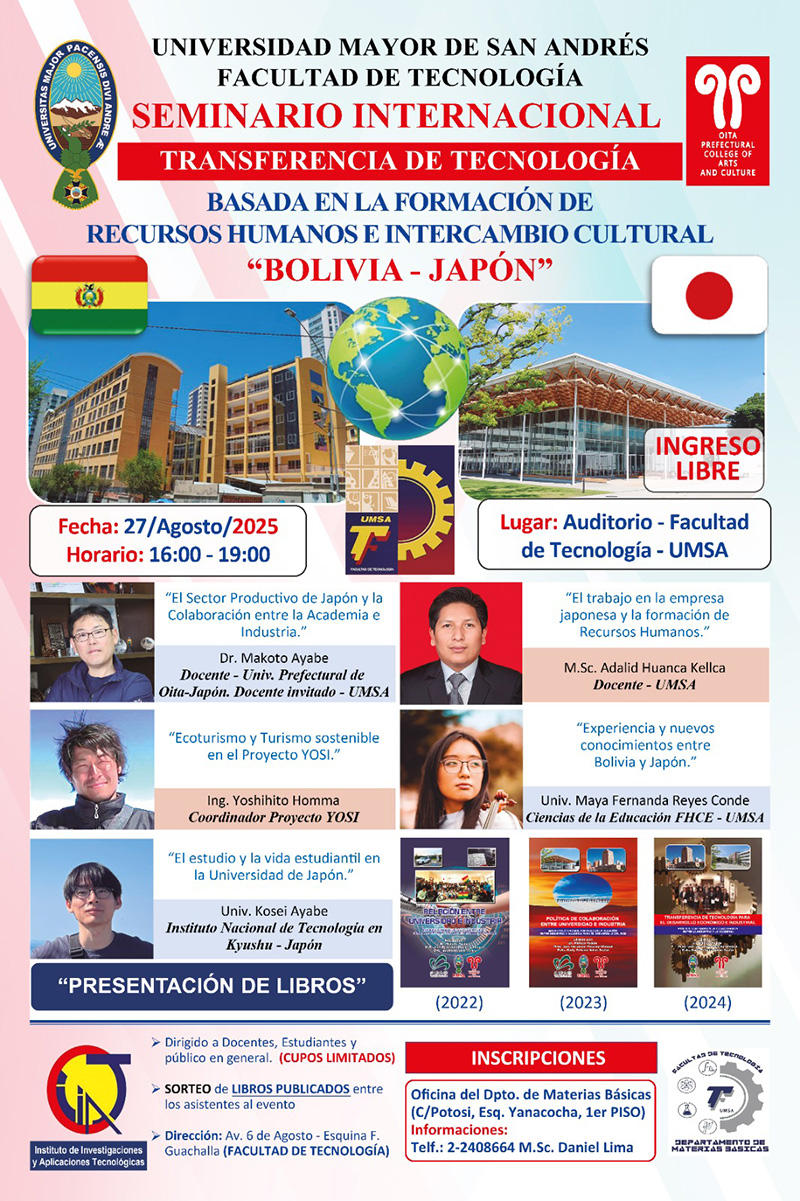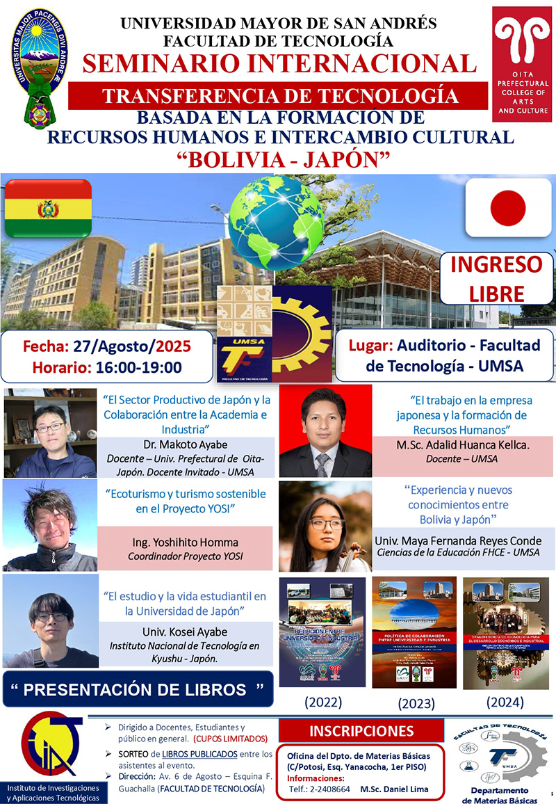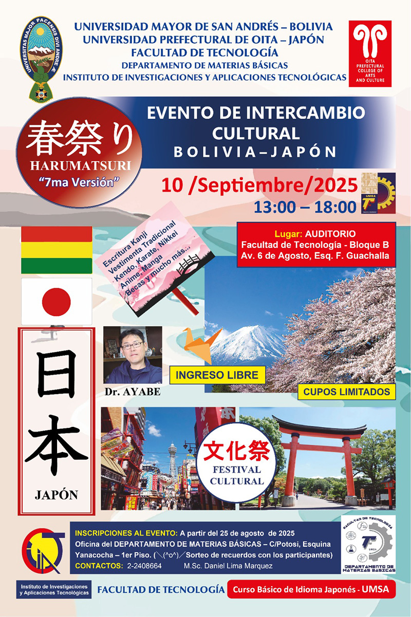 大分県立芸術文化短期大学の包括的学術協定校で、ボリビアの最高学府であるサンアンドレス国立大学(UMSA:Universidad Mayor de San Andés)において、8月27日(水)に国際セミナーが開催されます。また9月10日(水)には、第7回目となる日本文化祭(春祭り)が開催されます。