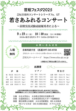 本学音楽科 前期実技試験成績優秀者を声楽・管弦打・ピアノの各コースから選抜し、独唱・独奏曲による演奏を披露する「芸短音楽科コンサートシリーズNo.119 若さあふれるコンサート」を9月19日(金)に開催します。