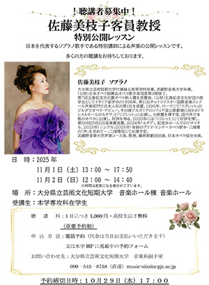 本学が誇る日本を代表するソプラノ歌手・佐藤美枝子客員教授による声楽のレッスンを11月1日(土)・2日(日)に開催します。レッスンは聴講することができます。多くの方の聴講をお待ちしております。