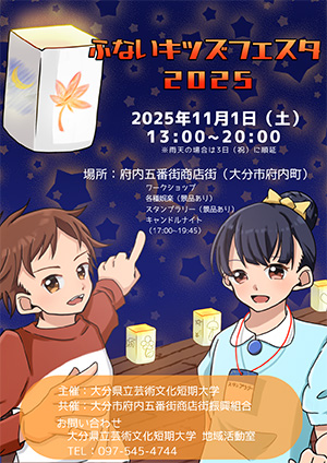 11月1日(土)に大分市にある府内五番街商店街において、学生企画による「ふないキッズフェスタ2025」を開催します。本学のサービスラーニングの一環として開催するお子様とご家族で楽しんで頂けるイベントです。