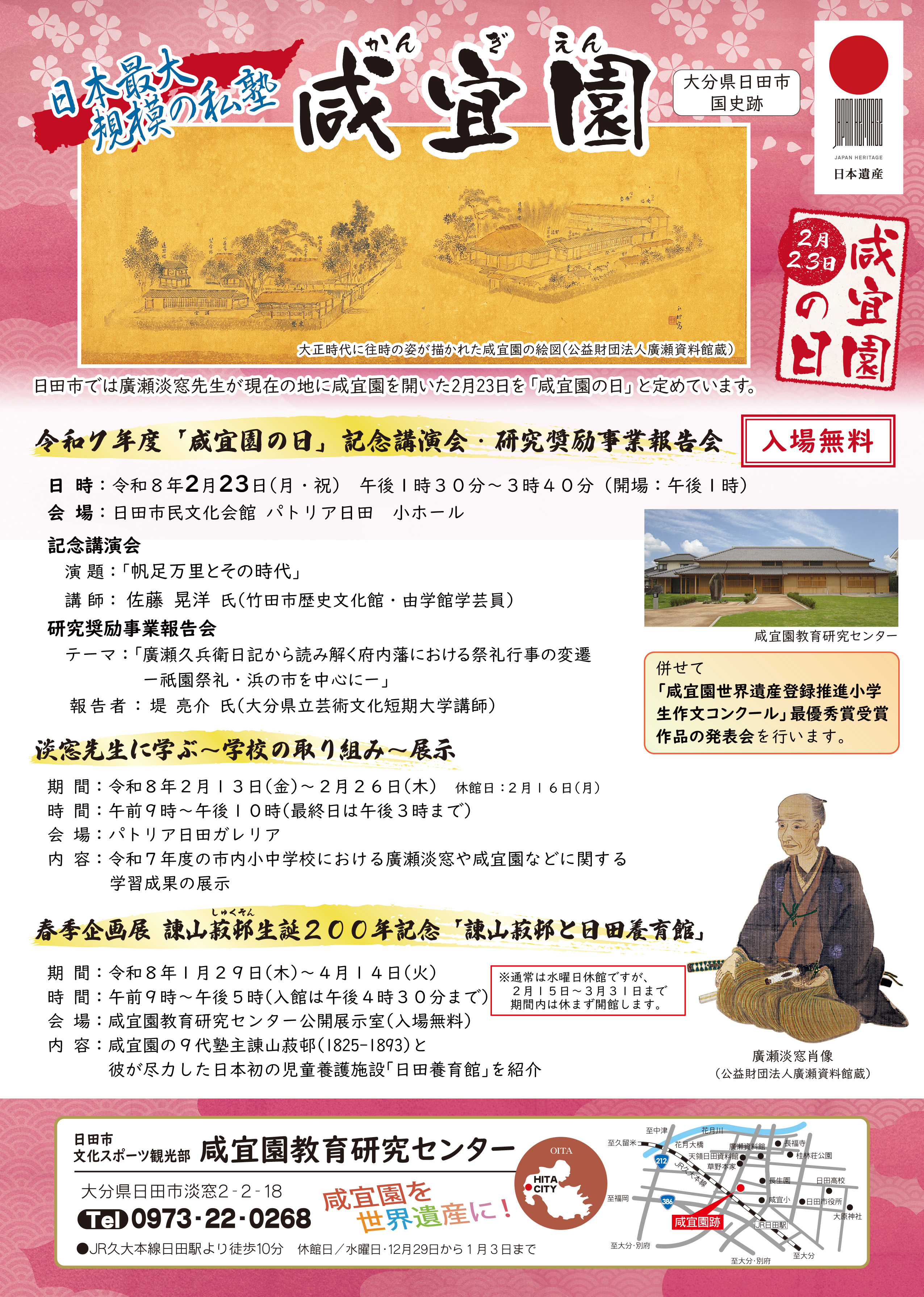 国際総合学科の堤亮介講師が日田市民文化会館 パトリア日田にて開催の「咸宜園の日」にて講演いたします。事前予約不要・入場料無料です。ぜひ、ご参加ください。