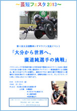 毎年「大分国際車いすマラソン大会」の時期にあわせて行うこのイベントも、4回目となりました。今回は、パラリンピックや世界選手権、世界各国で開催されるマラソン大会など、数多くの大会に出場する車いす陸上競技界のプロアスリート・廣道純選手による講演会を行います。