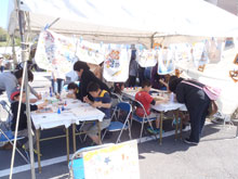 キャンパス地のバックに型紙を用いてステンシルによって模様を染めていくもので、動物や花など、いろんな型紙を用意しています。どなたでも気軽に、そして簡単にエコバックを作ることができますので、小さなお子様でも楽しく体験できます。ぜひ、お越しください。