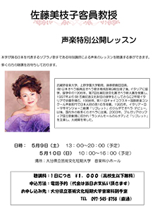 本学が誇る日本を代表するソプラノ歌手である佐藤美枝子客員教授による声楽のレッスンを5月9日(土)、10日(日)の2日間、聴講する事ができます。多くの方の聴講をお待ちしております。