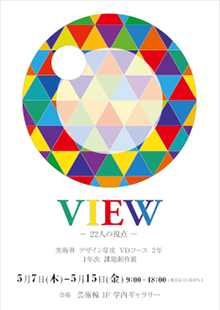 学内ギャラリー(芸術棟1階)では5月7日(木)~ 5月15日(金)、美術科デザイン専攻ビジュアルデザインコース2年生による作品展「VIEW 〜22人の視点〜」を開催します。