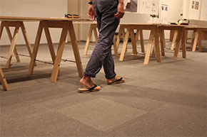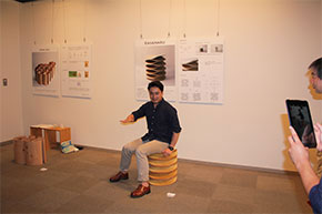 専攻科造形専攻プロダクトデザインコースの学生の作品が並ぶ「交差展 ~art exhibition8~」が9月3日(木)、iichiko総合文化センターの県民ギャラリー(B1)で始まりました。会場には様々な使い方ができるイスや段ボールを活用した照明、スプリング機能がある下駄や木製のクラッチバッグなどが展示されています。初日は観客の前で、各学生が自分の作品のプレゼンテーションを行いました。