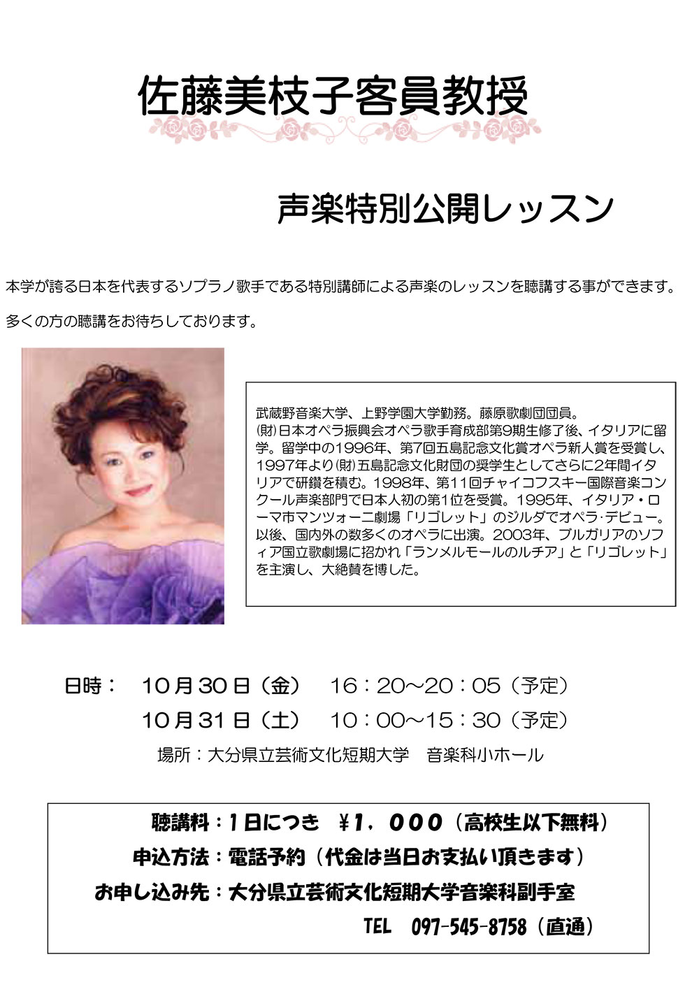 佐藤美枝子客員教授の声楽特別公開レッスンのお知らせ