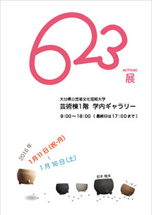 学内ギャラリー(芸術棟1階)では1月11日(月)~ 1月16日(土)、美術科デザイン専攻副手の岩本睦未さんによる作品展「623(MUTSUMI)展」を開催しています。
