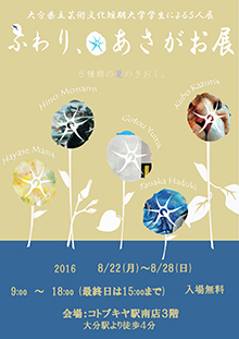 本学美術科美術専攻2年、早瀬麻乃さん、久保和菜さん、田中葉月さん、日野もなみさん、後藤由衣奈さんによる5人展「ふわり、あさがお展」を、8月22日(月)~8月28日(日)まで、コトブキヤ文具駅南店3階のギャラリーにて開催します。