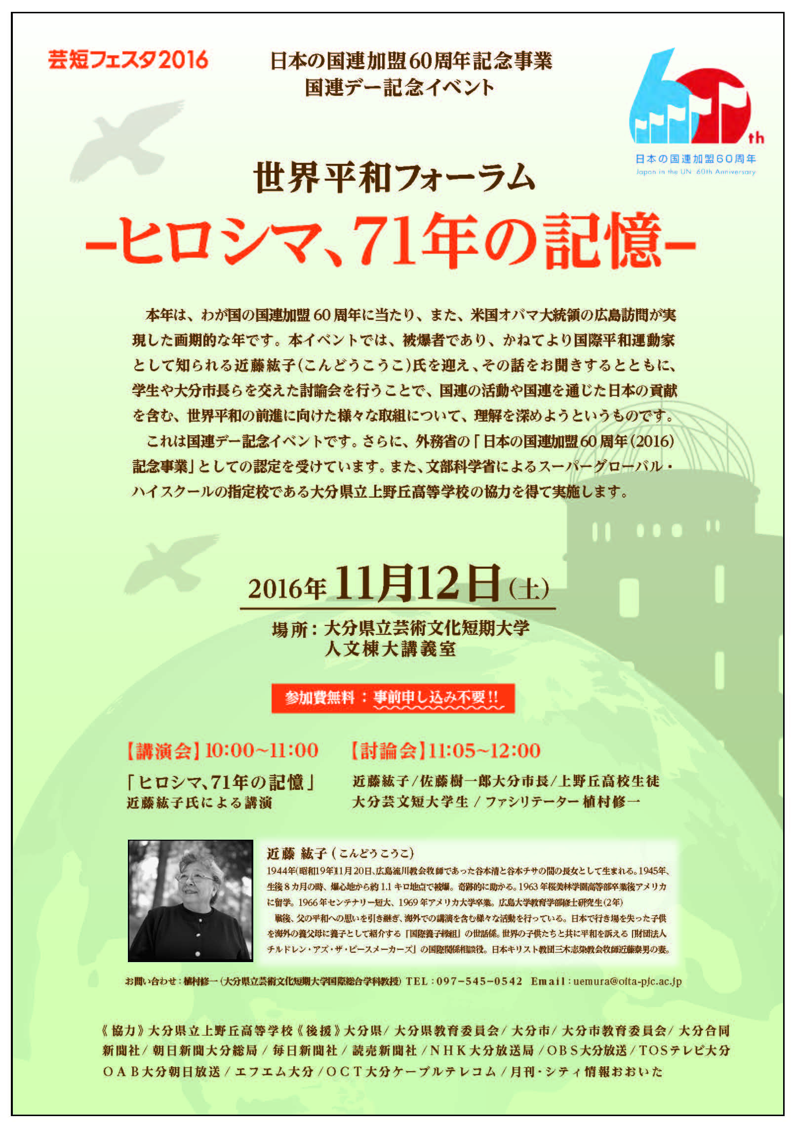 本イベントでは、被爆者であり、かねてより国際平和運動家として知られる近藤紘子(こんどうこうこ)氏を迎え、その話を聞くとともに、本学の学生や地元高校生、さらには大分市長らを交えた討論会を行うことで、国連の活動や国連を通じた日本の国際貢献を含め、世界平和の前進に向けた様々な取組について、理解を深めようというものです。
