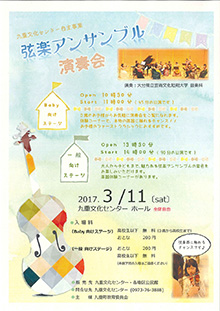 九重文化センター自主事業として開催される「弦楽アンサンブル演奏会」に、本学音楽科の学生が出演します。
