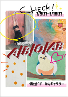 学内ギャラリー(仮校舎1階)では、1月9日(火)~ 1月16日(火)、美術科美術専攻2年江藤 彩さん、大神 真理絵さん、志柿 晴華さん、岡原 未宥さんによる作品展「bloodtype A/B/O/AB」を開催します。