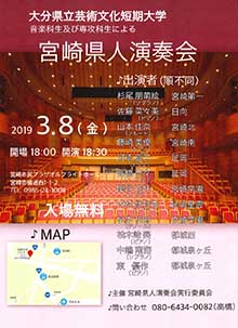 3月8日(金)、宮崎市民プラザオルブライトホールにて、本学 音楽科生及び専攻科生による「宮崎県人演奏会」を開催します。皆さま、ぜひお越しください!