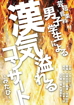 7月8日(月)、本学 人文棟1階 大講義室にて「音楽科男子学生による漢気溢れる コンサート ~みたび~」を開催します。