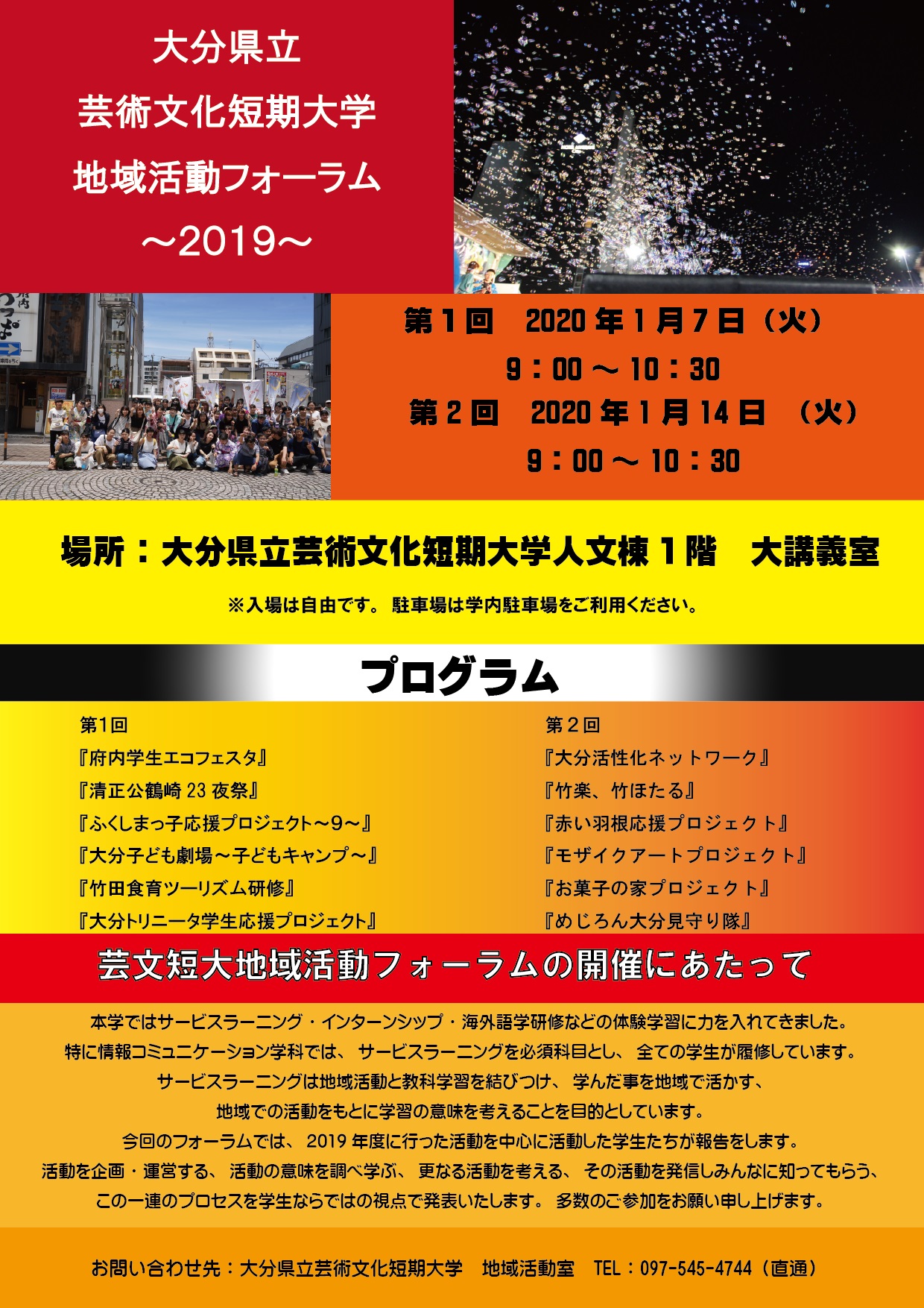 2020年1月7日(火)、14日(火)、本学 大講義室にて「大分県立芸術文化短期大学 地域活動フォーラム~2019~」を開催します。