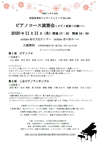 11月11日(水)、iichiko総合文化センターiichiko音の泉ホールにて、芸短音楽科コンサートシリーズNo.108「ピアノコース演奏会~ピアノ音楽への誘い~」を開催します。ぜひ、足をお運びください。