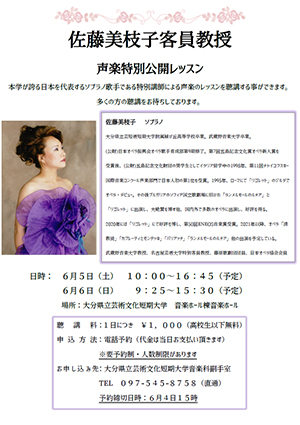 2021年6月5日(土)、6日(日)の両日、本学 音楽ホールにて「佐藤美枝子客員教授 声楽特別公開レッスン」を開催します。
