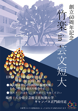 2021年に大分県立芸術文化短期大学は創立60周年を迎えました。この記念事業として「竹楽 in 芸文短大」を2021年10月23日(土)に大学キャンパス内で実施しま す。