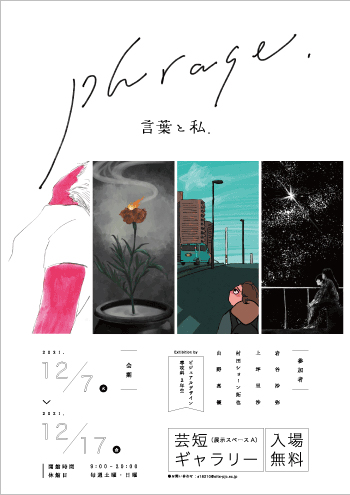 専攻科造形専攻ビジュアルデザインコース2年による「phrase. 〜言葉と私〜」を美術棟 芸短ギャラリーで開催します。