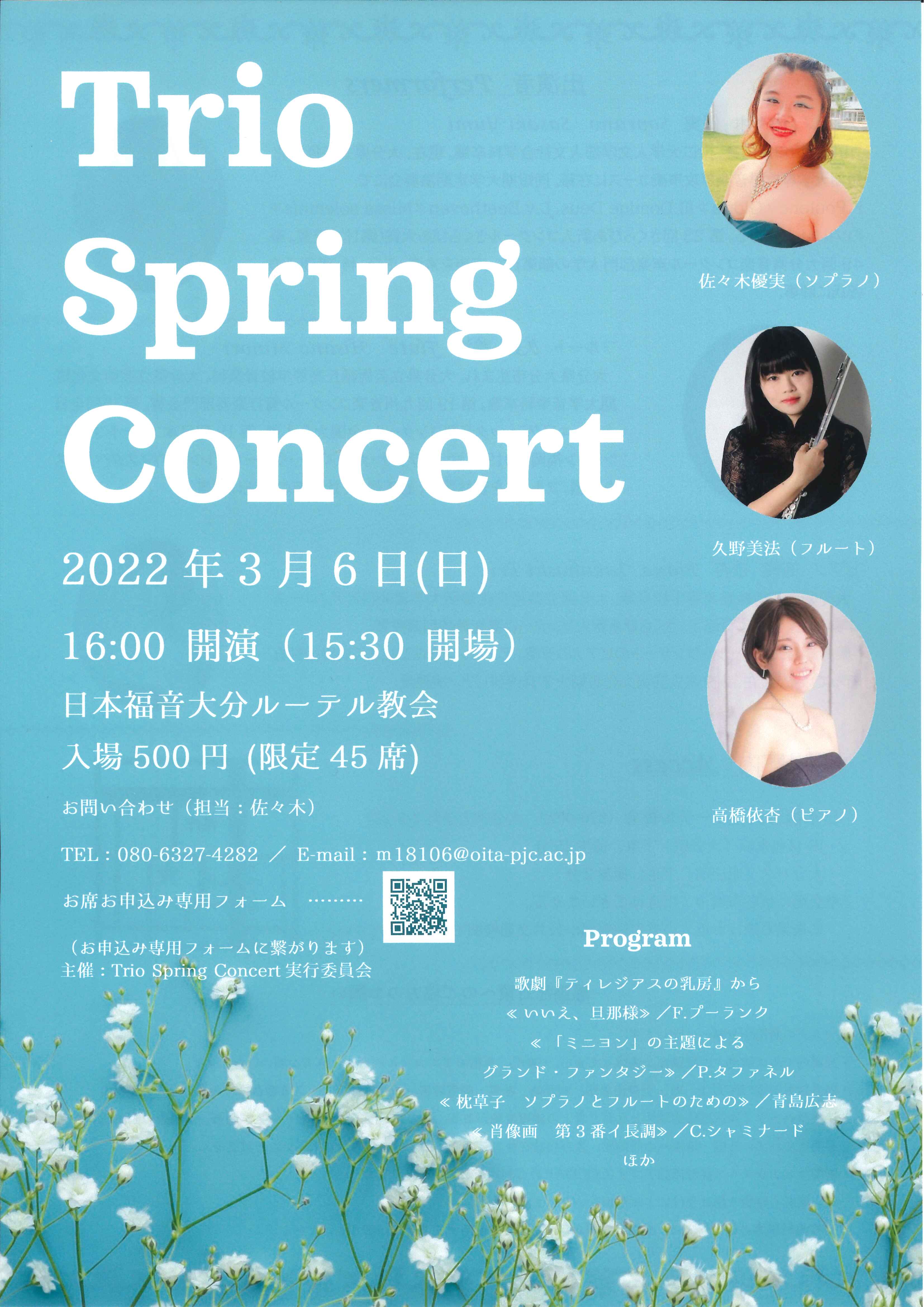 3月6日(日)、日本福音ルーテル大分協会にて本学音楽科学生・卒業生による「Trio Spring Concert」を開催します。