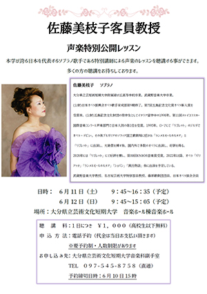 2022年6月11日(土)、12日(日)の両日、本学 音楽ホールにて「佐藤美枝子客員教授 声楽特別公開レッスン」を開催します。
