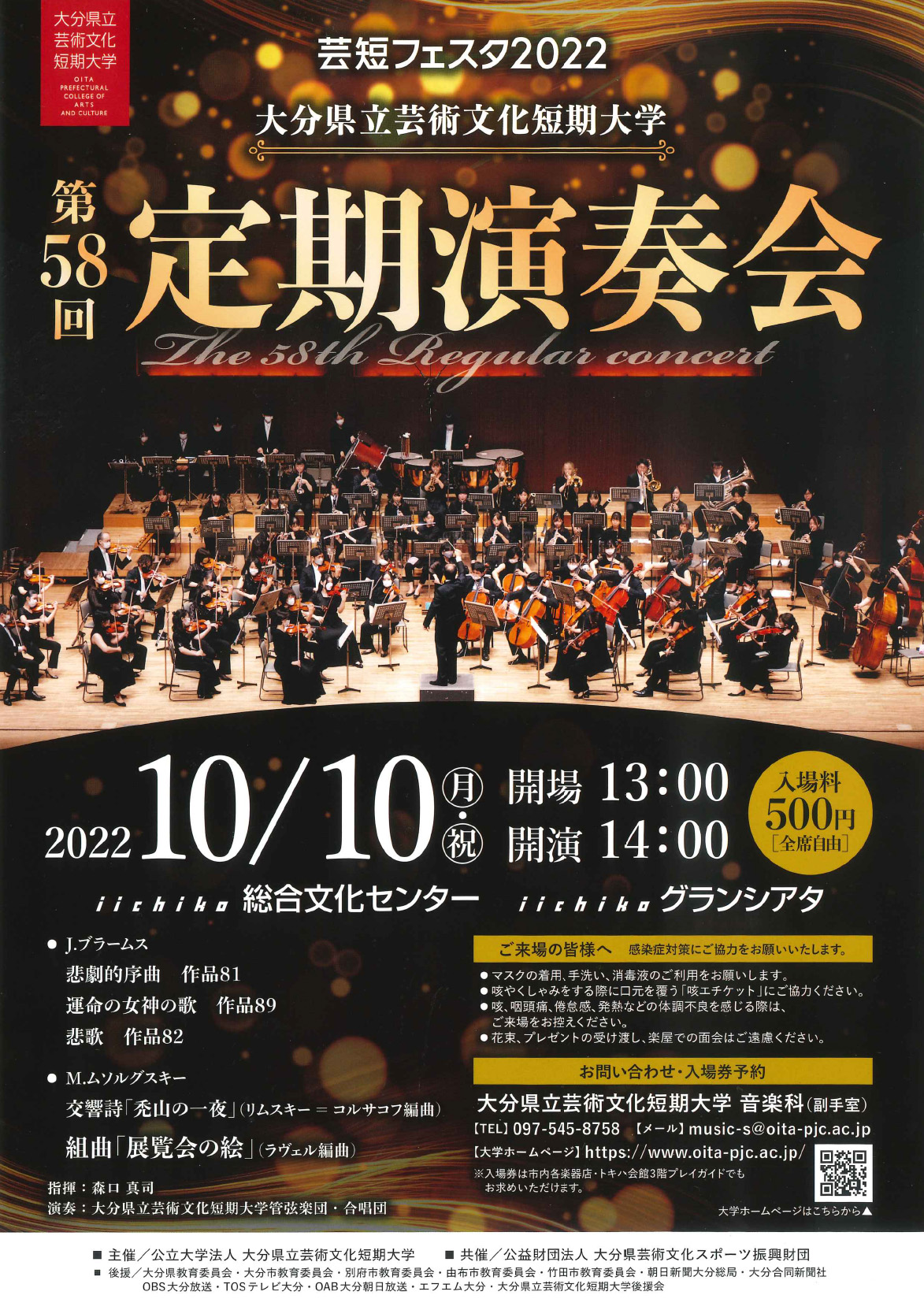 本学音楽科の最大イベント「第58回定期演奏会」を、10月10日(月・祝)iichiko総合文化センターiichikoグランシアタにて開催します。このイベントは、芸文短大音楽科・専攻科音楽専攻の全学生と全教員、卒業生らが出演者およびスタッフとして総力を挙げて取り組んでいるものです。