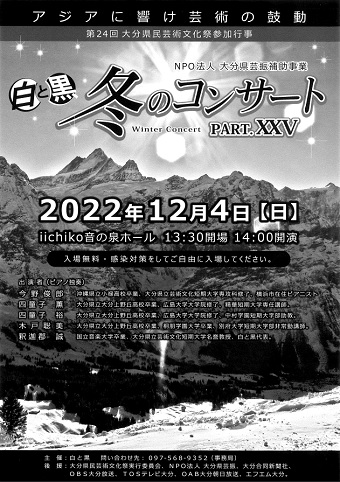 12月4日(日)、iichiko音の泉ホールに「白と黒 冬のコンサート」が開催されます。本学名誉教授の釈迦郡誠が出演します。