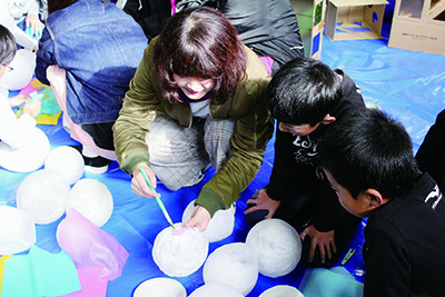 子どもたちの造形美術に対する興味や感性を引き出し、創作の喜びや楽しさを味わってもらうことを目的とした地域貢献活動(2005年より毎年実施)。県内各地の小学校を訪れて、学生と子ども達が一緒になって作品づくりを体験します。