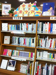 公募により選ばれた音楽科専攻科2名、情報コミュニケーション学科4名の6名の学生が選書委員となり、直接書店に出向いて約2時間、1人2万円の予算で、図書館に置く本を選びました。