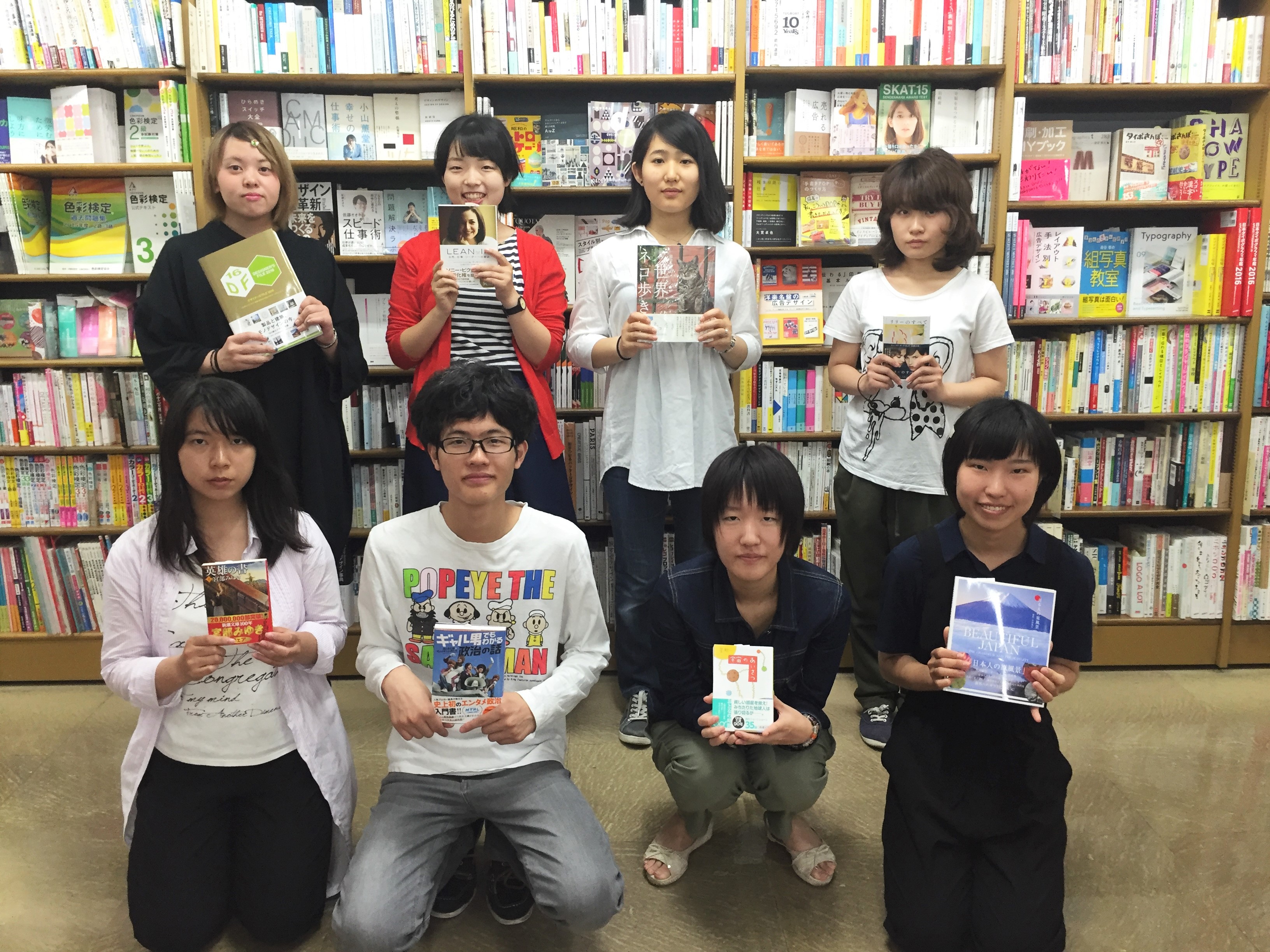 公募により選ばれた8名の学生(美術科3名、音楽科1名、国際総合学科3名、情報コミュニケーション学科1名)が、約2時間かけて、1人2万円の予算で図書館に置く本を選んでくれました。たくさん並んでいる本の中から、他の学生におすすめしたい本、勉強に役立ちそうな本、自分が興味のある本など、悩みながら吟味・選書していました。