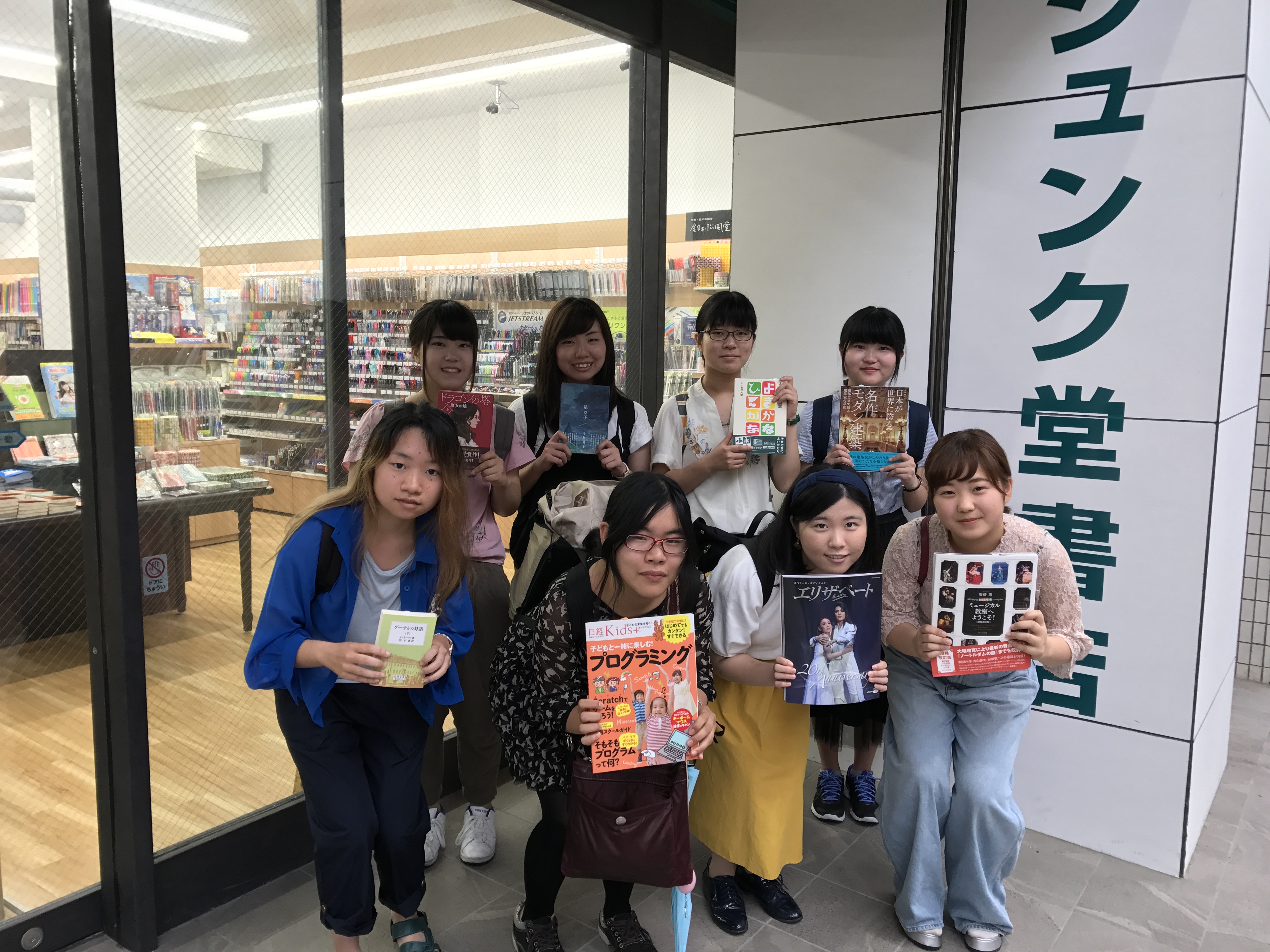 公募により選ばれた8名の学生(美術科2名、音楽科2名、国際総合学科3名、情報コミュニケーション学科1名)が、約2時間かけて、ひとり2万円の予算で図書館に置く本を選んでくれました。たくさん並んでいる本の中から、他の学生におすすめしたい本、勉強に役立ちそうな本、自分が興味のある本など、悩みながら吟味、選書していました。