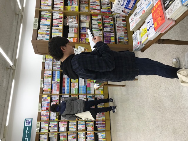 を行ったり来たり、あるいは一つの棚の前で考え込んだりと、たくさん並べられた本の中から、それ
