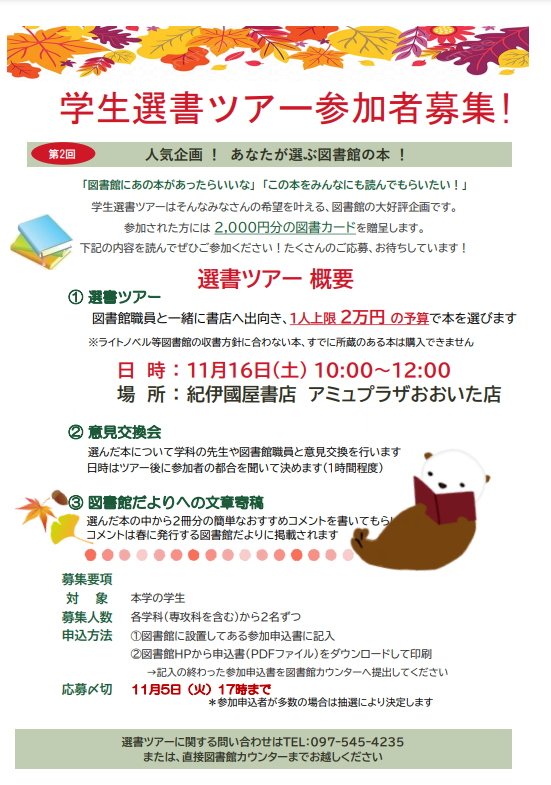 ※ 選書ツアーに関する問い合わせはTEL:097-545-4235 または、直接図書館カウンターまでお越しください。