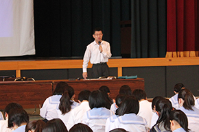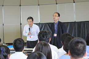 まず体育館での全体説明会で、教務学生部の洲部長から本学の概要の説明があり、国際総合学科、情報コミュニケーション学科を含む全学科の説明をしました。