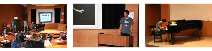 講演の最後に『美しい星』のラストシーンの音楽をライブバージョンで演奏していただきました。次第に日が落ちる大講義室での渡邊氏の演奏は耳に心地よく、参加者はそれぞれに演奏と情緒に浸っているようでした。
