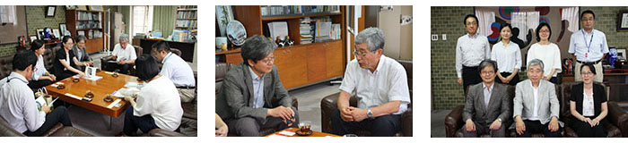 1日目は本学から中山欽吾学長と久々宮事務局長、国際総合学科 疇谷学科長と朴准教授を交え、歓談を行いました。歓談の中で平中助教授は、本学から釜山外国語大学に編入学をした学生の近況報告(現地の高校で日本語を教えるなど意欲的な留学生活の様子)なども語っていただきました。