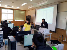 ファブラボとは何か、モデリングの概念と3Dプリンターの仕組みなどについての講義と本学実習助手と“ものづくり女子隊”が行う、「オリジナルステッカーを作ろう」の実習を20人が1時限ごとに交代して、受講しました。